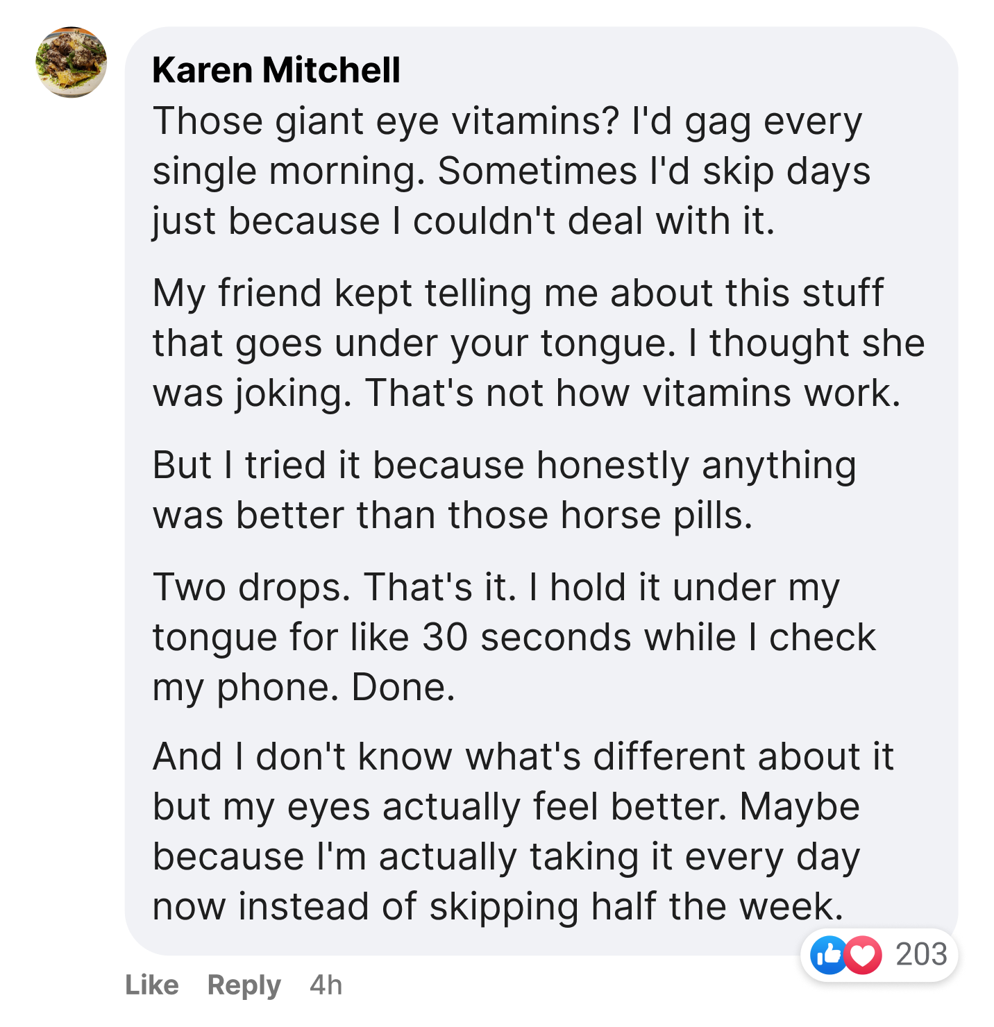 All these ingredients are great but only if they actually reach your eyes. Under your tongue, they go straight to your bloodstream. No stomach breaking them down first.