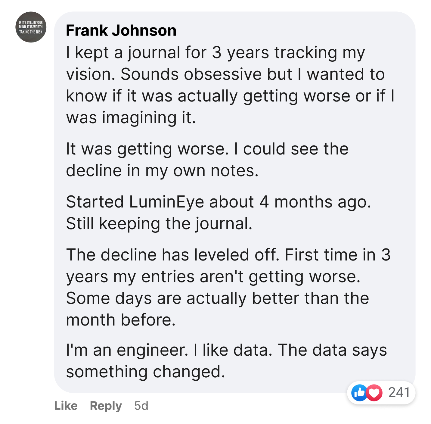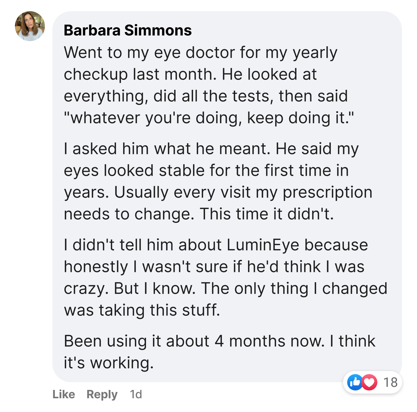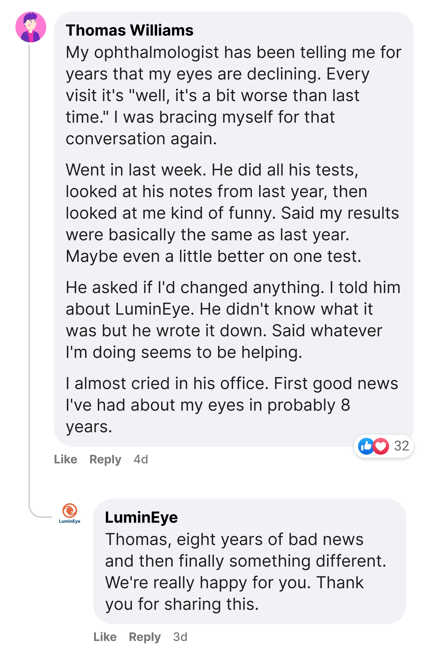 Disclaimer: Results based on survey of 3,324 LuminEye customers. LuminEye™ is not intended to diagnose, treat, cure, or prevent any disease. Results vary based on lifestyle, diet, and how often you use it.