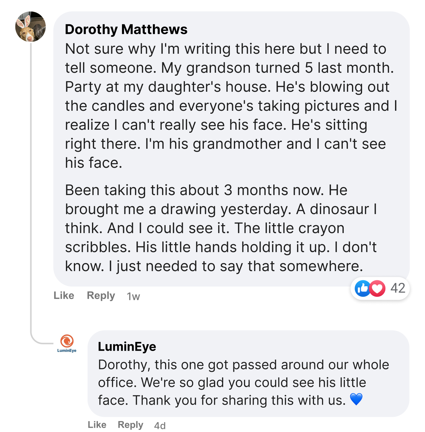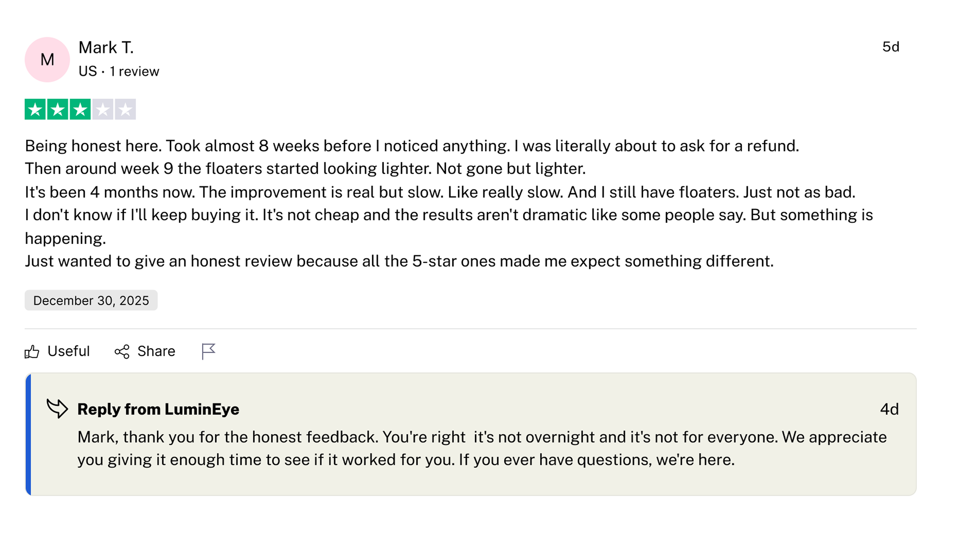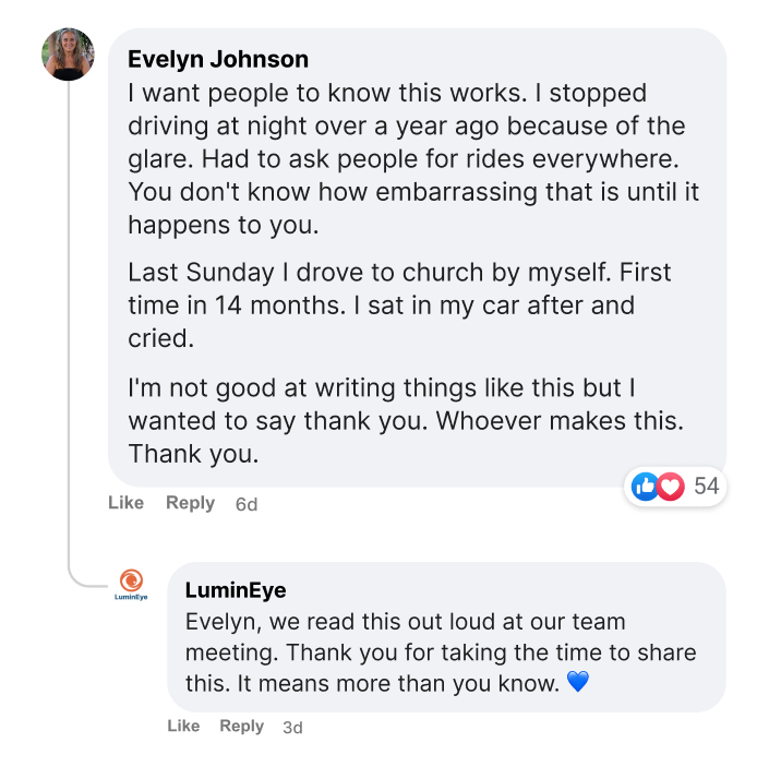 Disclaimer: Results based on survey of 3,324 LuminEye customers. LuminEye™ is not intended to diagnose, treat, cure, or prevent any disease. Results vary based on lifestyle, diet, and how often you use it.