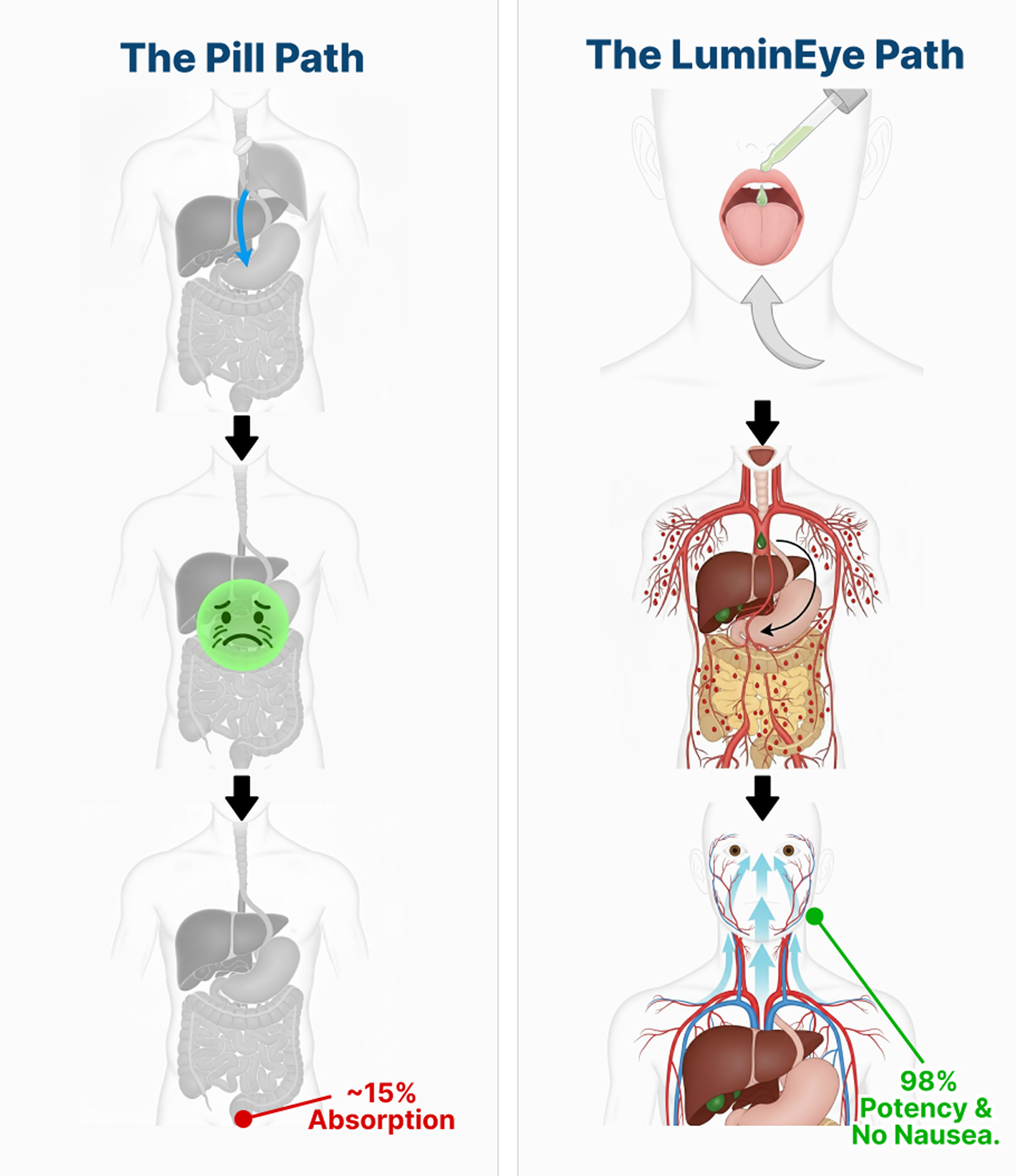 Most eye supplements come in pill or capsule form. The problem? Your digestive system destroys up to 85% of the nutrients before they ever reach your eyes. LuminEye is different. Our sublingual nano-drops go under your tongue and absorb directly into your bloodstream—bypassing digestion entirely. That means 98% of the 24 eye-specific nutrients actually reach your eyes. If past supplements failed you, this is likely why.